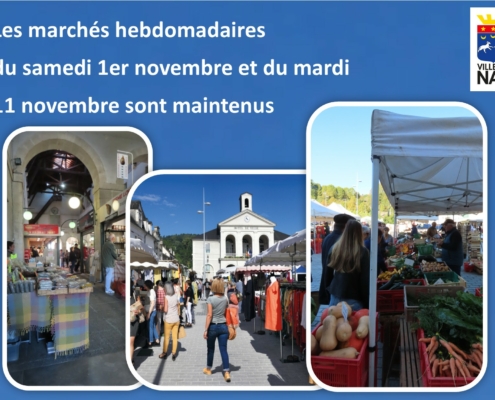 Les marchés hebdomadaires du 1er et 11 novembre sont maintenus aux horaires habituels. Attention il n’y aura pas de navette marché le 1er et 11 novembre.