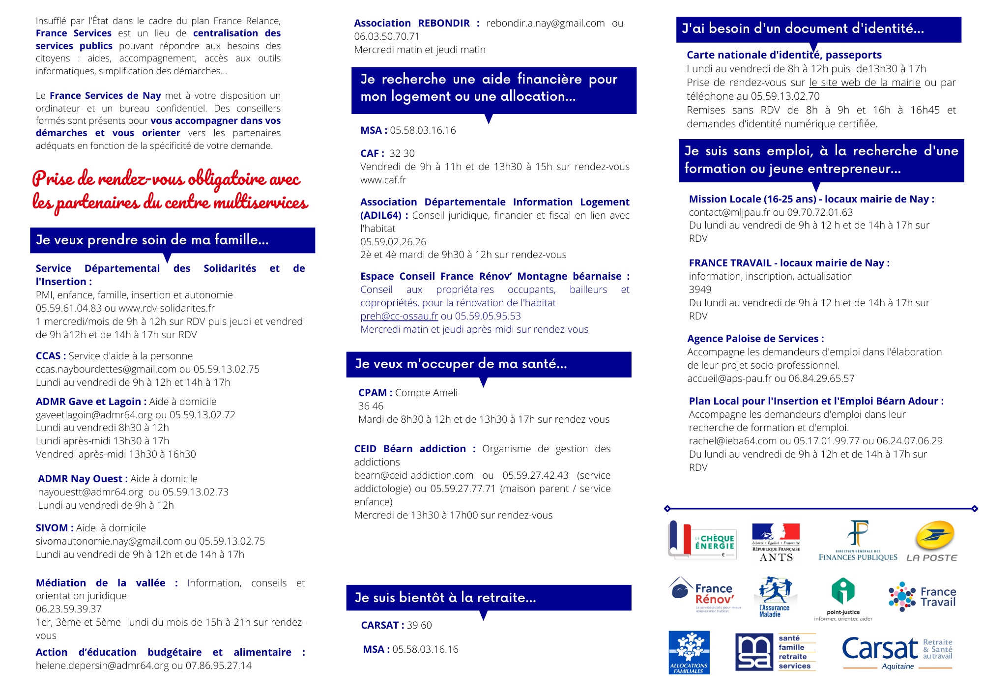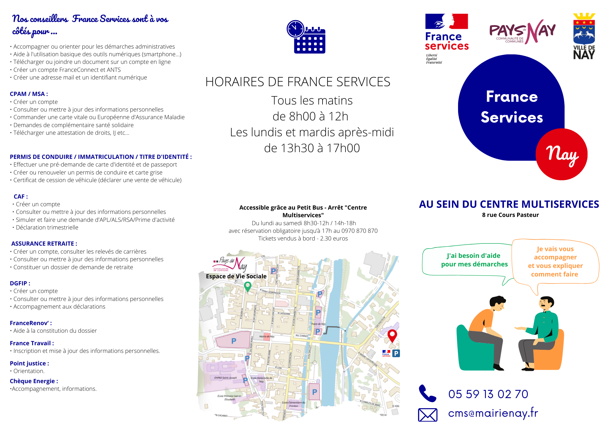 le centre multiservices s’est doté d’un espace « France Services », créé en partenariat avec la Communauté des Communes du Pays de Nay. L’obtention de cette labellisation est un gage de qualité et de service rendu aux usagers.